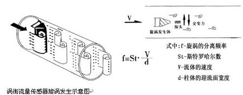 一定雷諾數范圍內(2×104~7×106 ),旋渦的釋放頻率f與流體流速V及旋渦發生體的迎流面寬度d之間關系式為f=St?v/d,式中St為斯特勞哈數,它是一個無量綱的系數,只要準確測出頻率f,就可以求得流體流速v,由v求出體積流量。